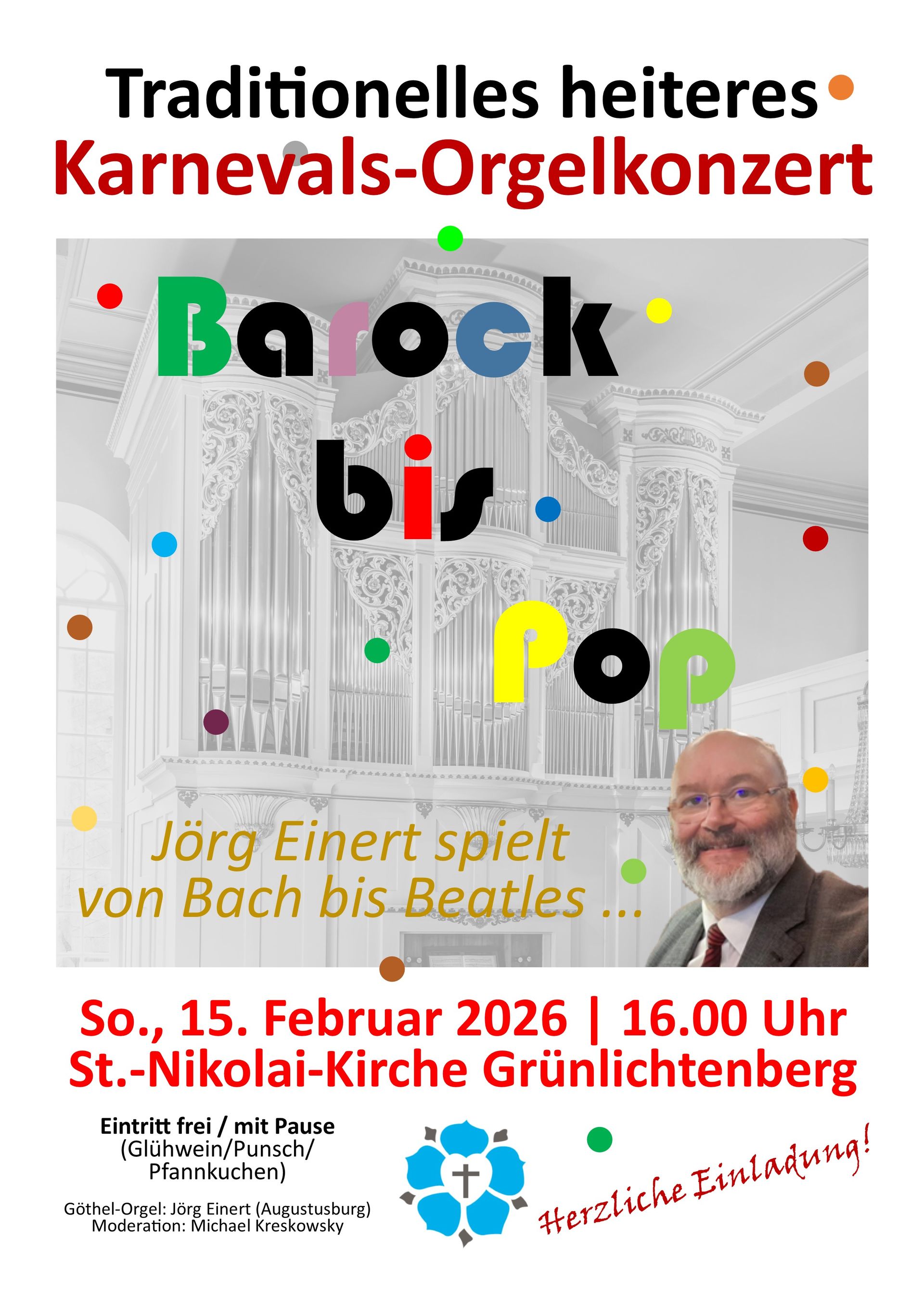 16.00 Uhr Grünlichtenberg Heiteres Karnevals-Orgelkonzert ENTFÄLLT WEGEN KRANKHEIT