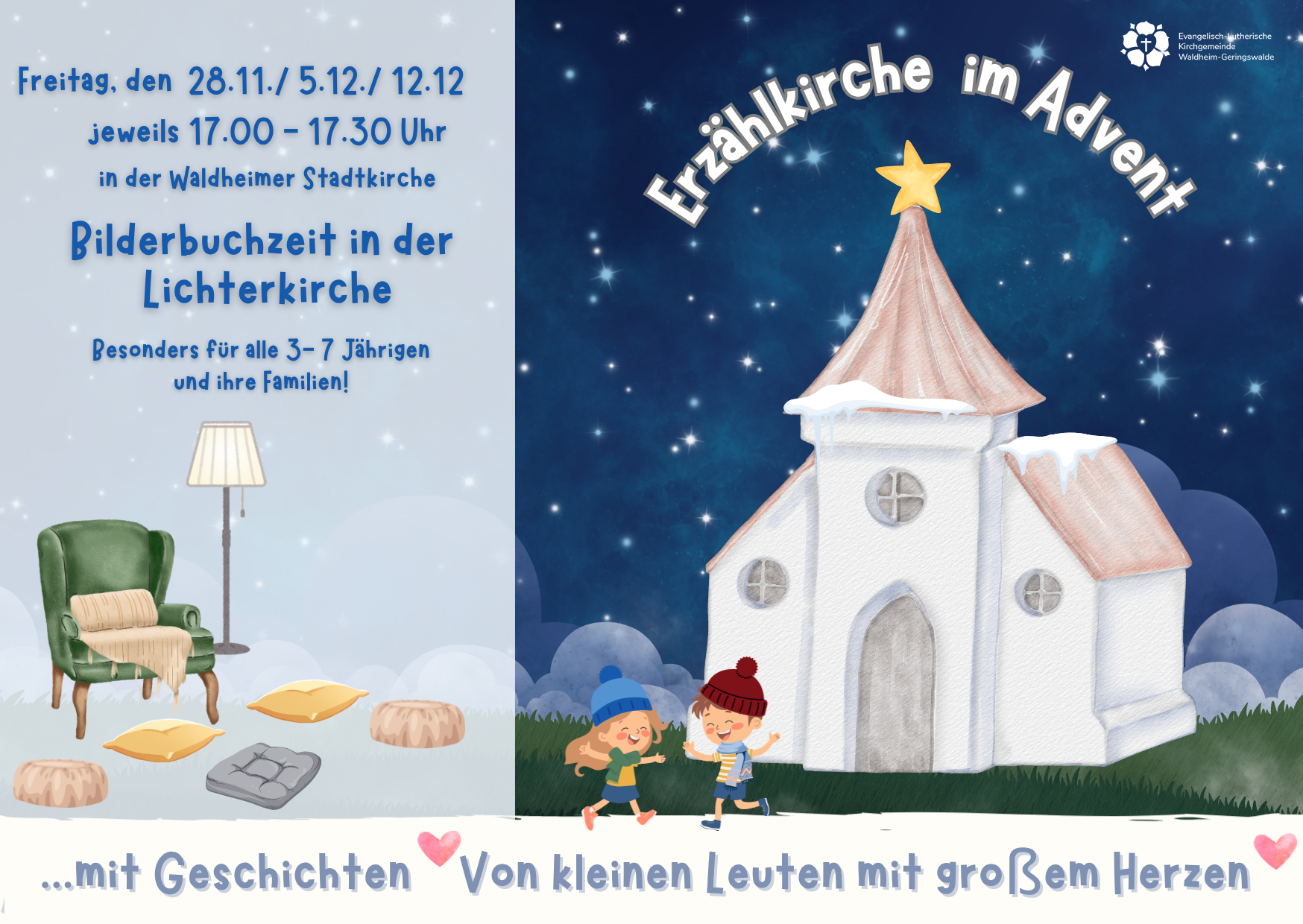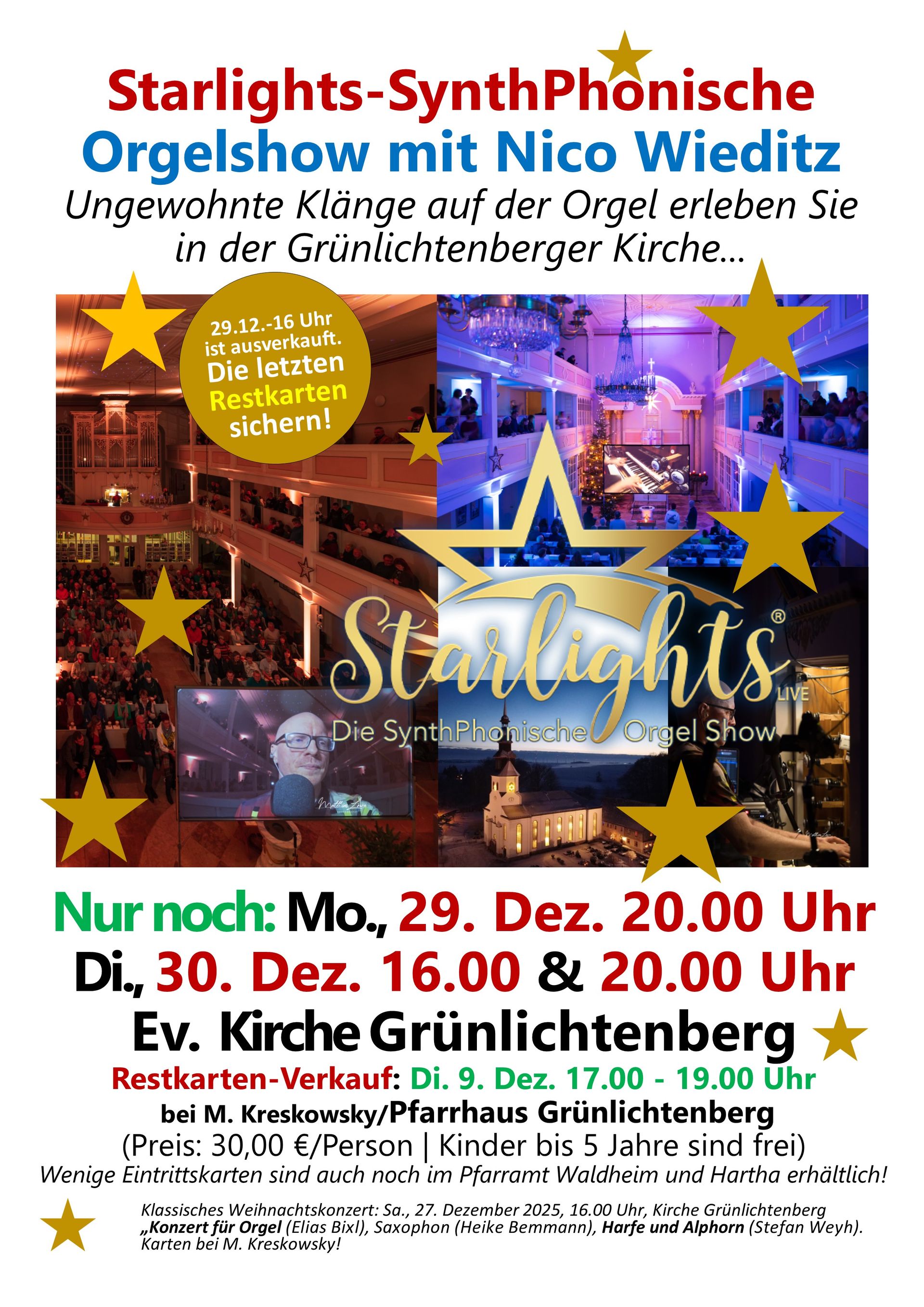 Am 27. Dezember 2025 laden wir in die Grünlichtenberger Kirche zu einem besonderen Weihnachtskonzert ein. Zu erleben ist Elias Bixl an der historischen Göthel-Orgel von 1867, Heike Bemmann am Saxophon und Stefan Weyh mit Alphorn und Harfe. Vor dem Konzert und in der Pause werden Getränke und ein Imbiss angeboten. Sichern Sie sich ihre Eintrittskarten. Erhältlich im Pfarramt Waldheim oder Gemeindebüro Grünlichtenberg bei Michael Kreskowsky am 9. und 23. Dezember 2025 zwischen 17.00 und 19.00 Uhr.
